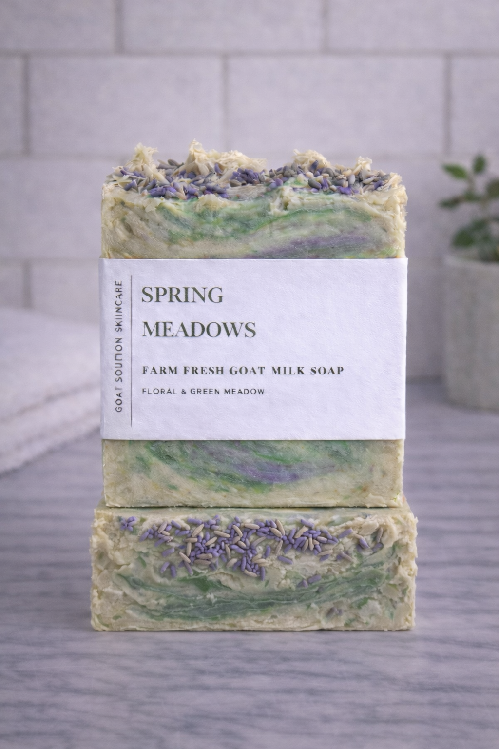 Spring Meadows is a calming, detoxifying goat milk soap infused with lavender and French green clay to gently purify, balance, and soften the skin. This creamy, botanical bar captures the scent of fresh florals and green fields in bloom clean, peaceful, and perfectly spring.