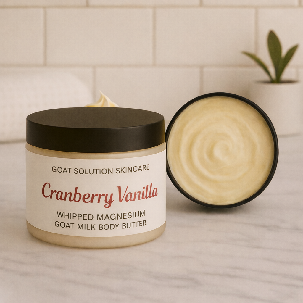 Wrap your skin in the cozy sweetness of the holidays with our Vanilla Cranberry Whipped Magnesium Goat Milk Body Butter. Handcrafted with nutrient-rich farm fresh goat milk, magnesium, and deeply moisturizing butters, this velvety blend nourishes from within while leaving behind a scent that feels both bright and comforting like a cozy winter treat.